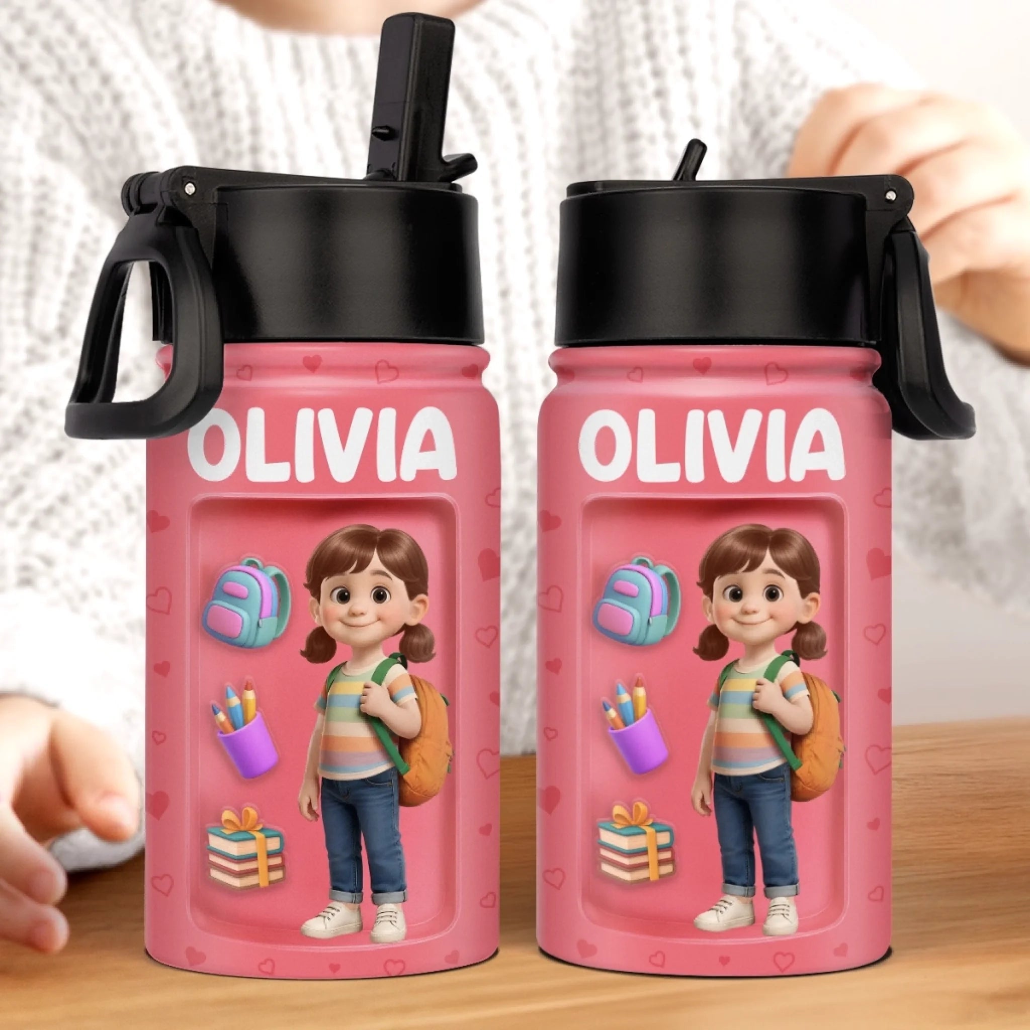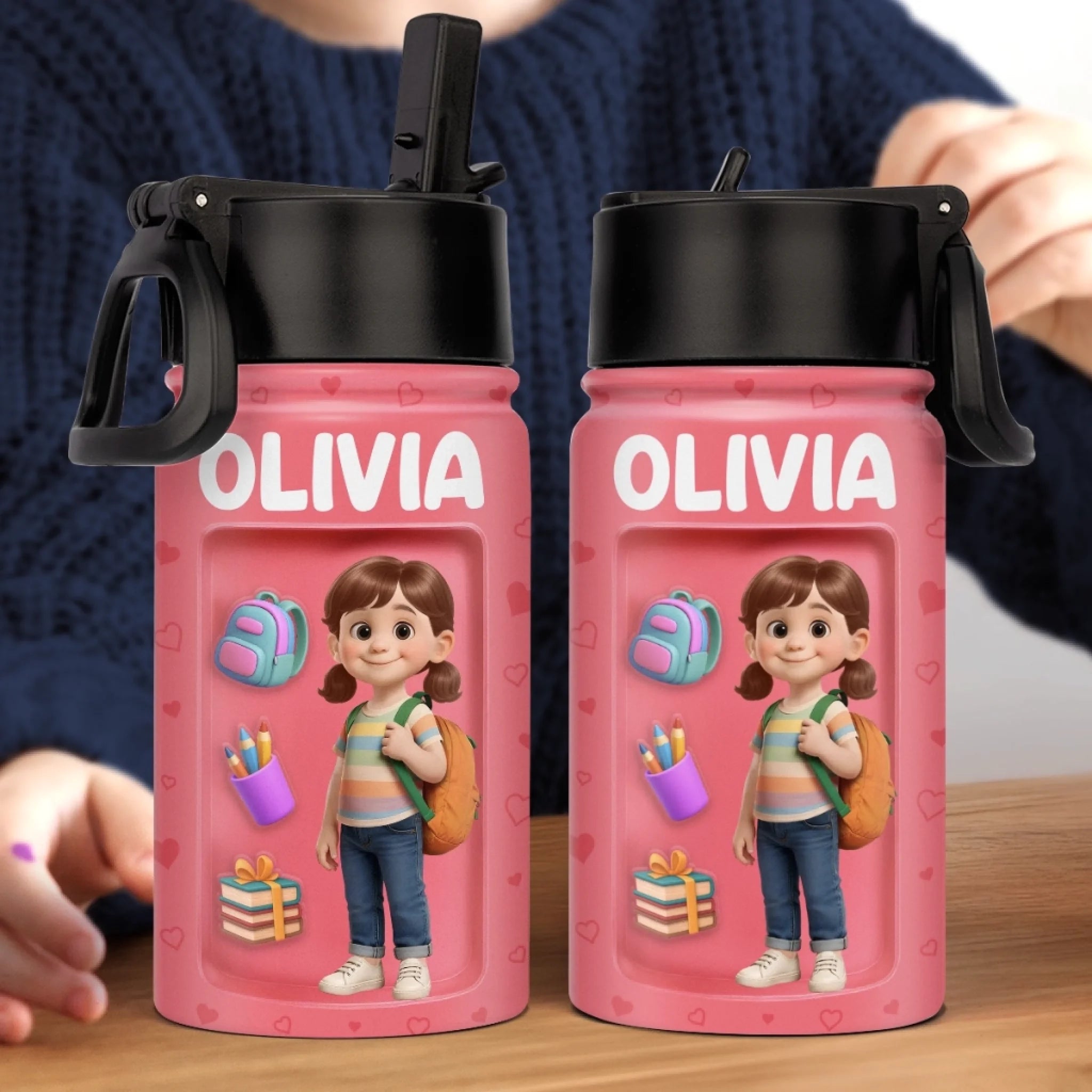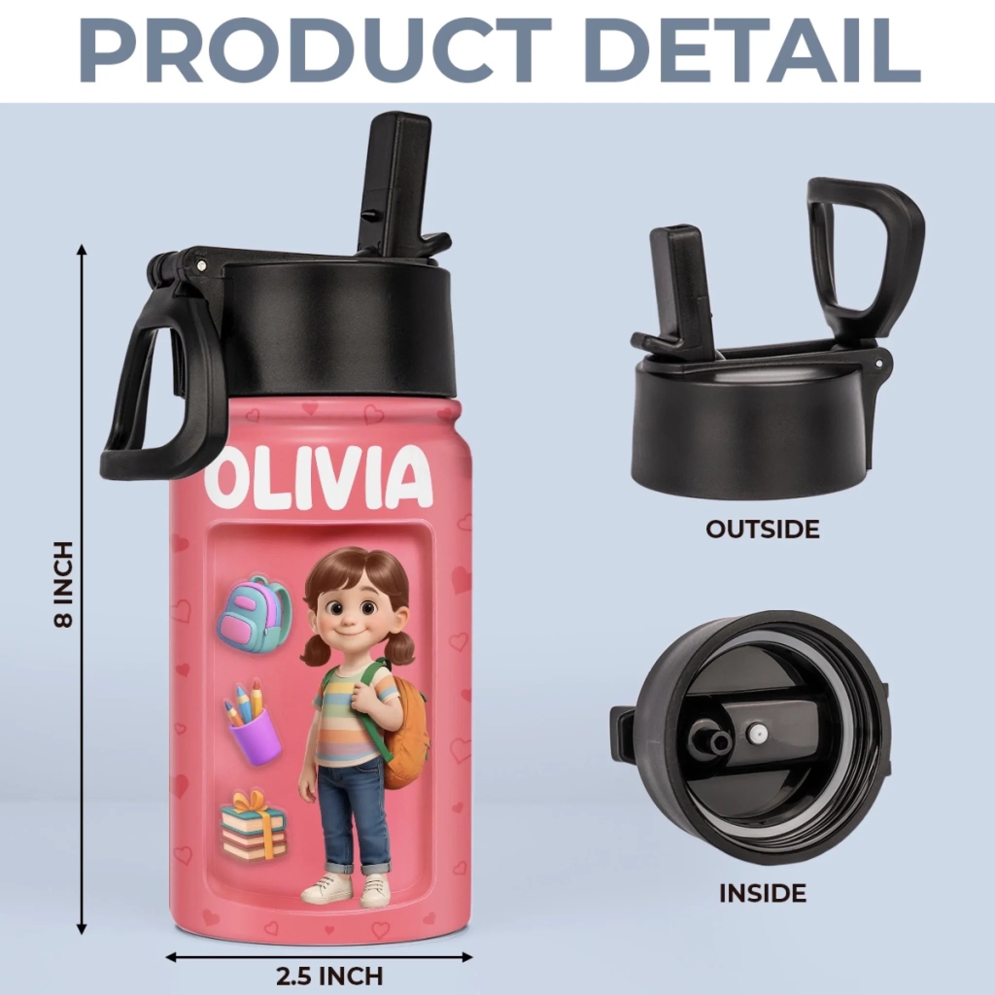 Custom 3D Inflated Effect Printed Kids Water Bottle - Personalized Back To School Gifts For Kids - Backpack Adventures Start With A Sip