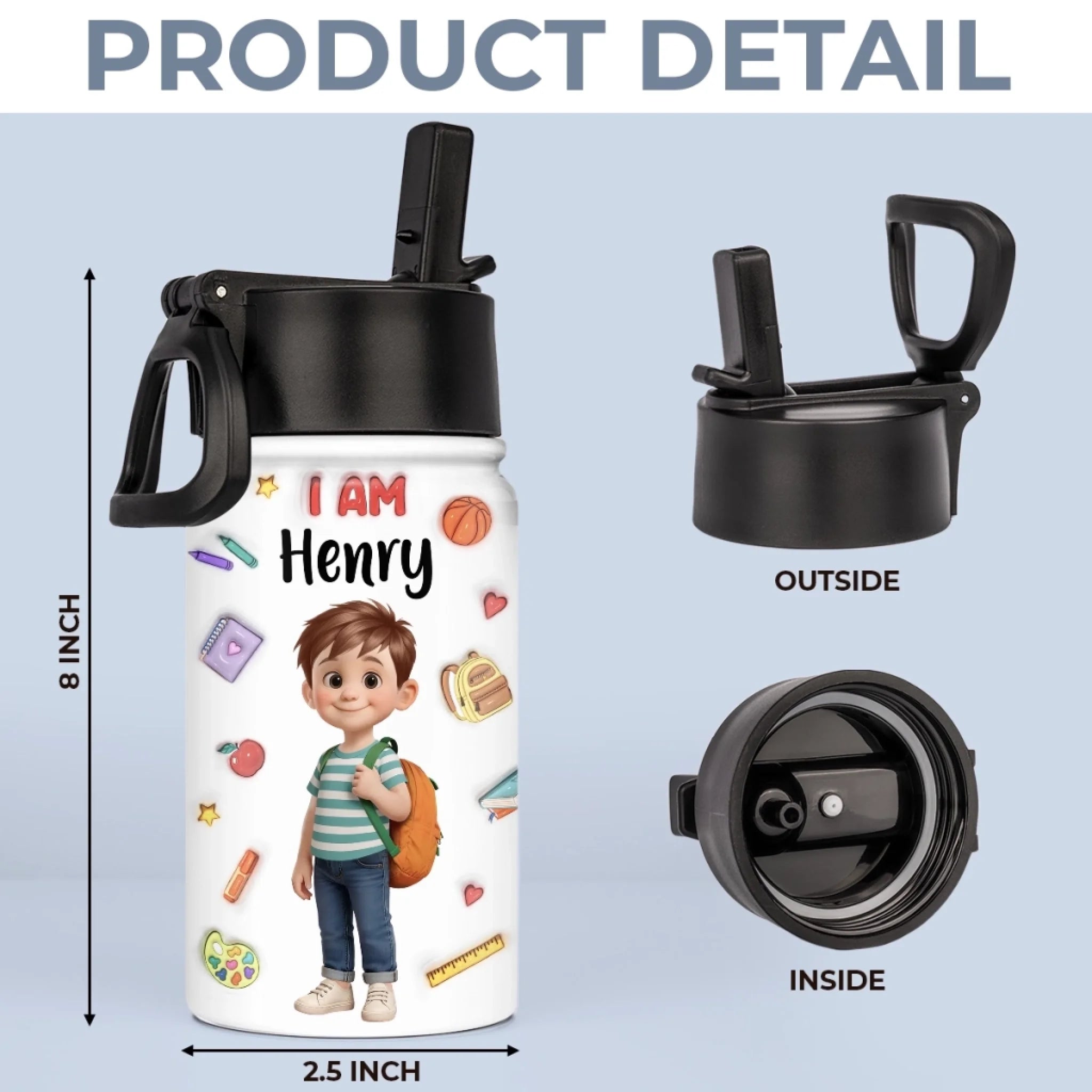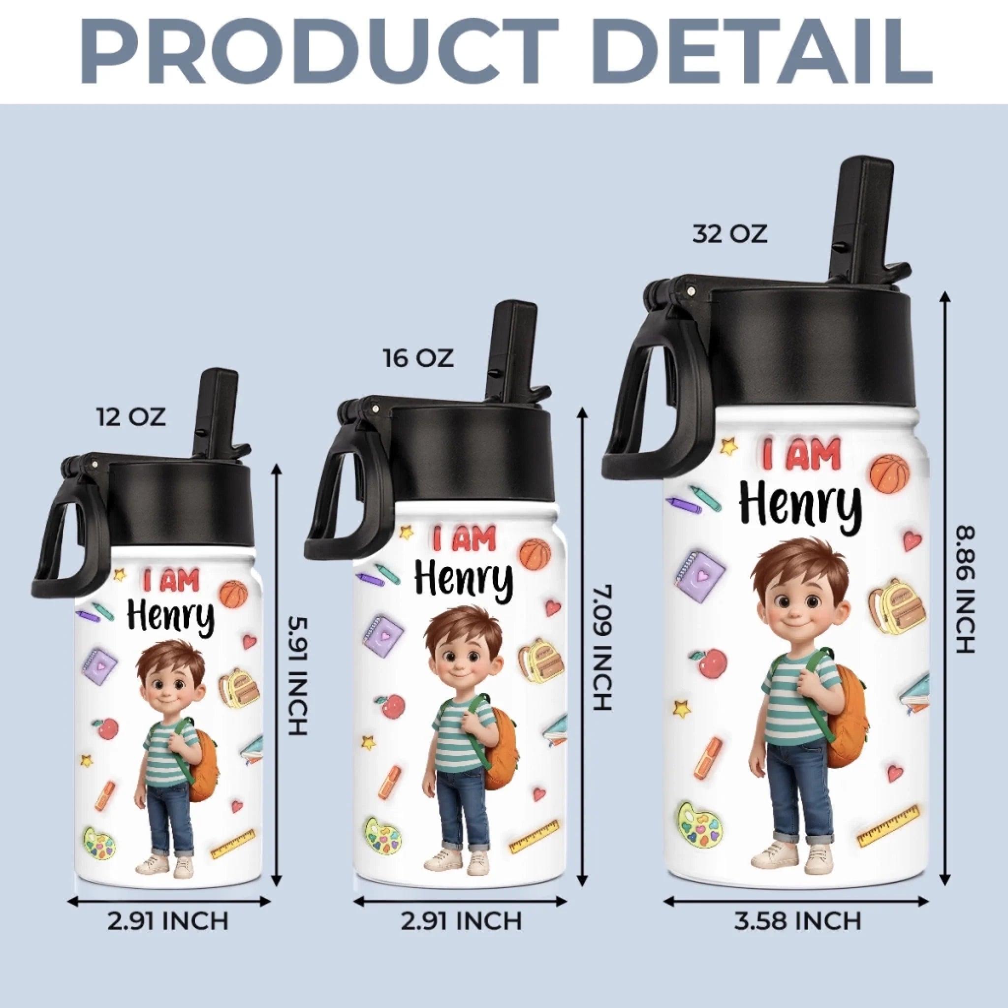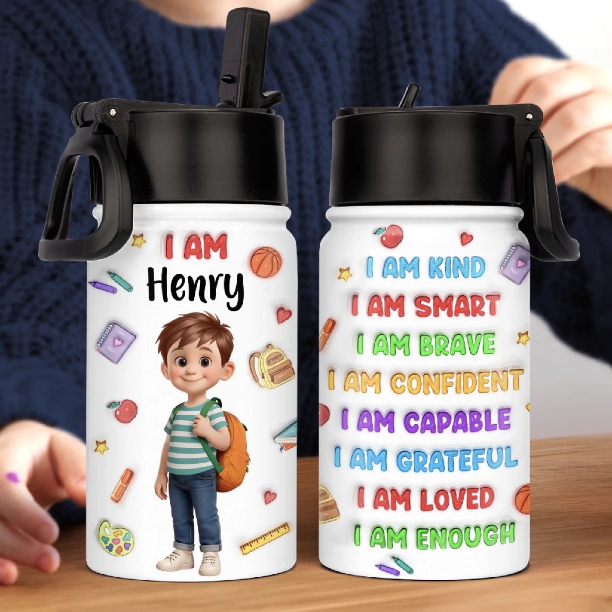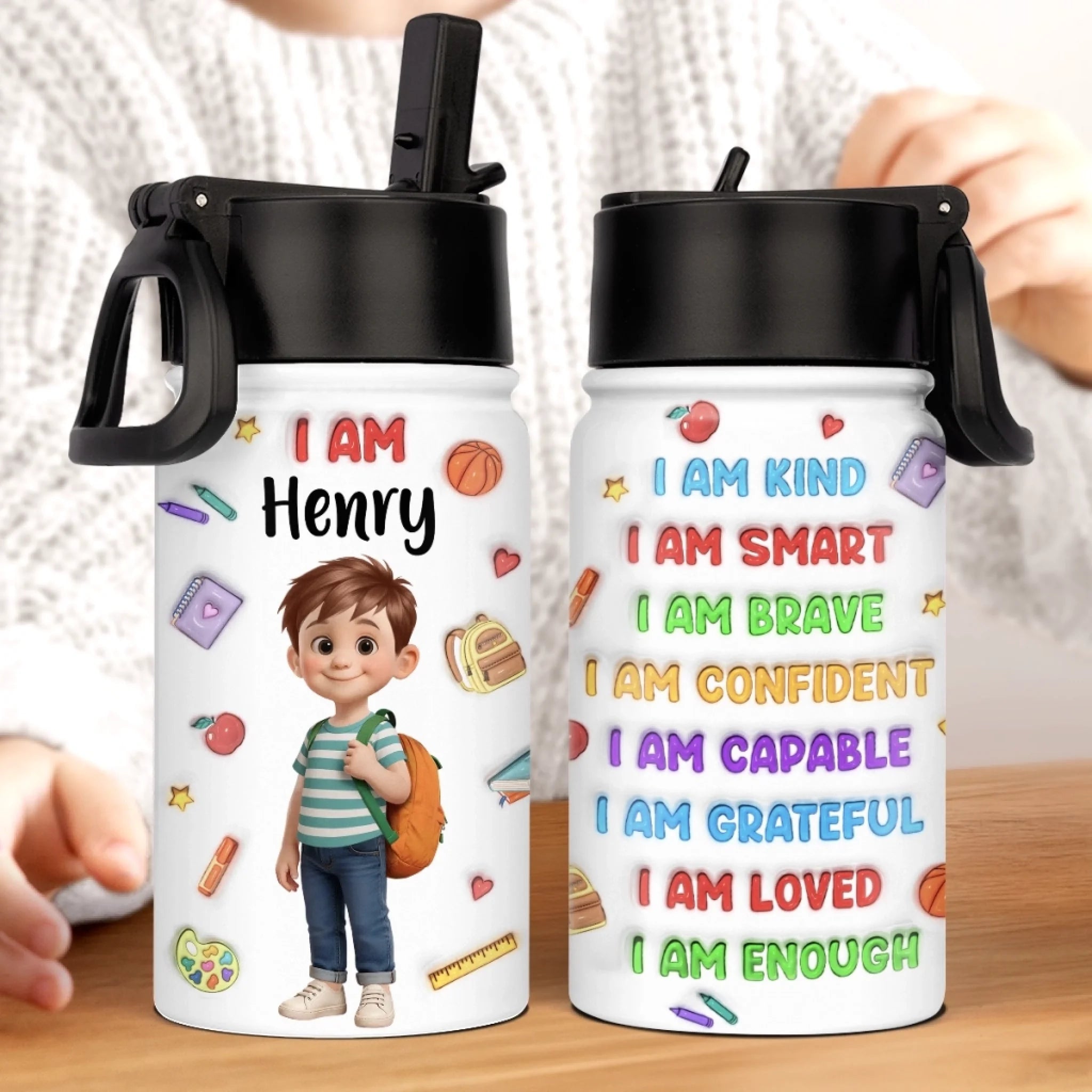 Custom 3D Inflated Effect Printed Kids Water Bottle - Personalized Back To School Gifts For Kids - I Am Brave Bold And Smart