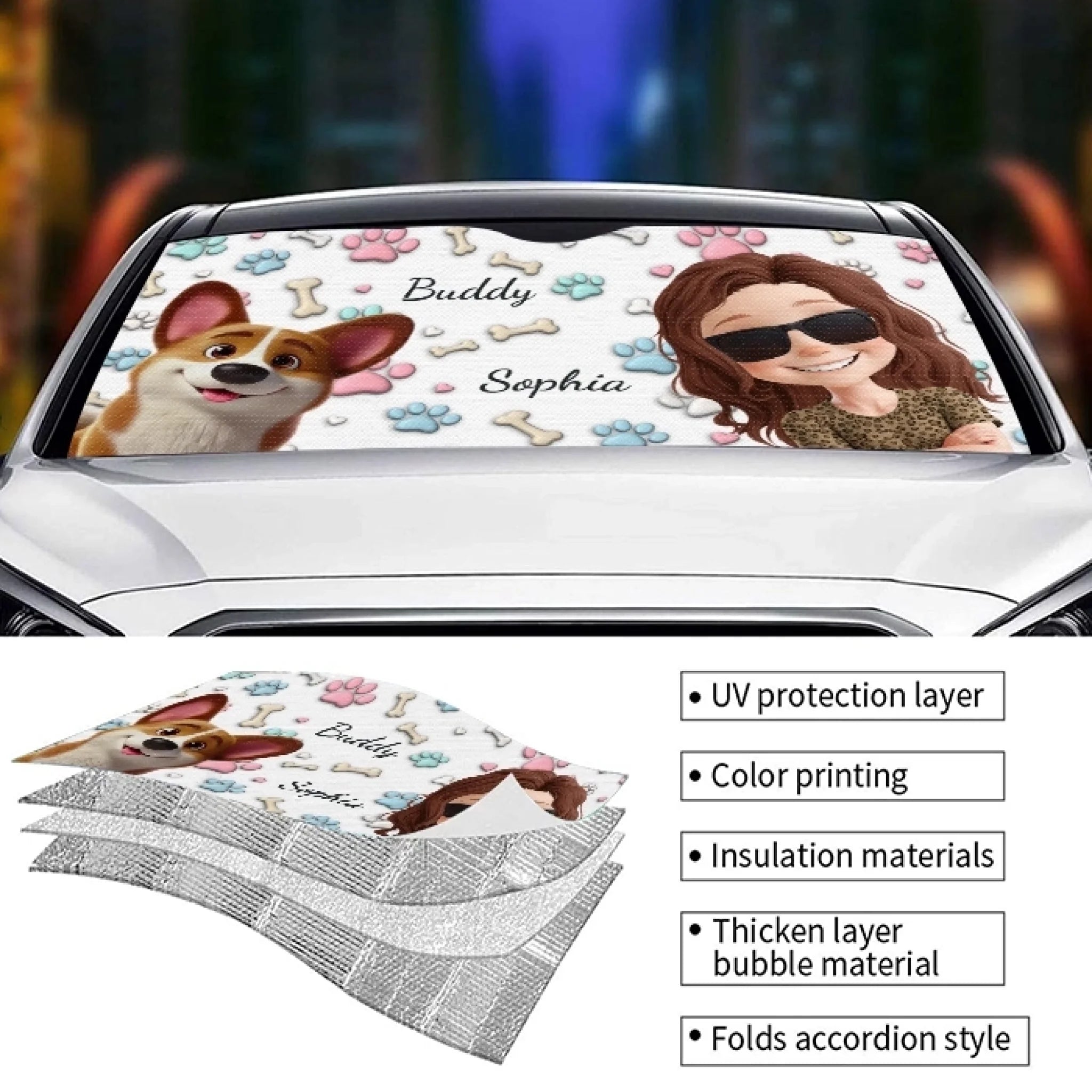 Personalized auto sunshade is an excellent way to protect your vehicle from harmful ultraviolet radiation while maintaining the original interior and extending the life of dashboards, radios, LCD screens, GPS systems, and other electronic equipment without fading or cracking! It's also a great gift for your loved ones who want to make their cars more appealing.