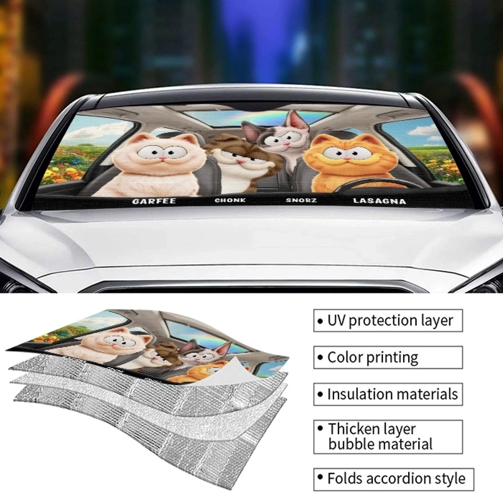 Personalized auto sunshade is an excellent way to protect your vehicle from harmful ultraviolet radiation while maintaining the original interior and extending the life of dashboards, radios, LCD screens, GPS systems, and other electronic equipment without fading or cracking! It's also a great gift for your loved ones who want to make their cars more appealing.
