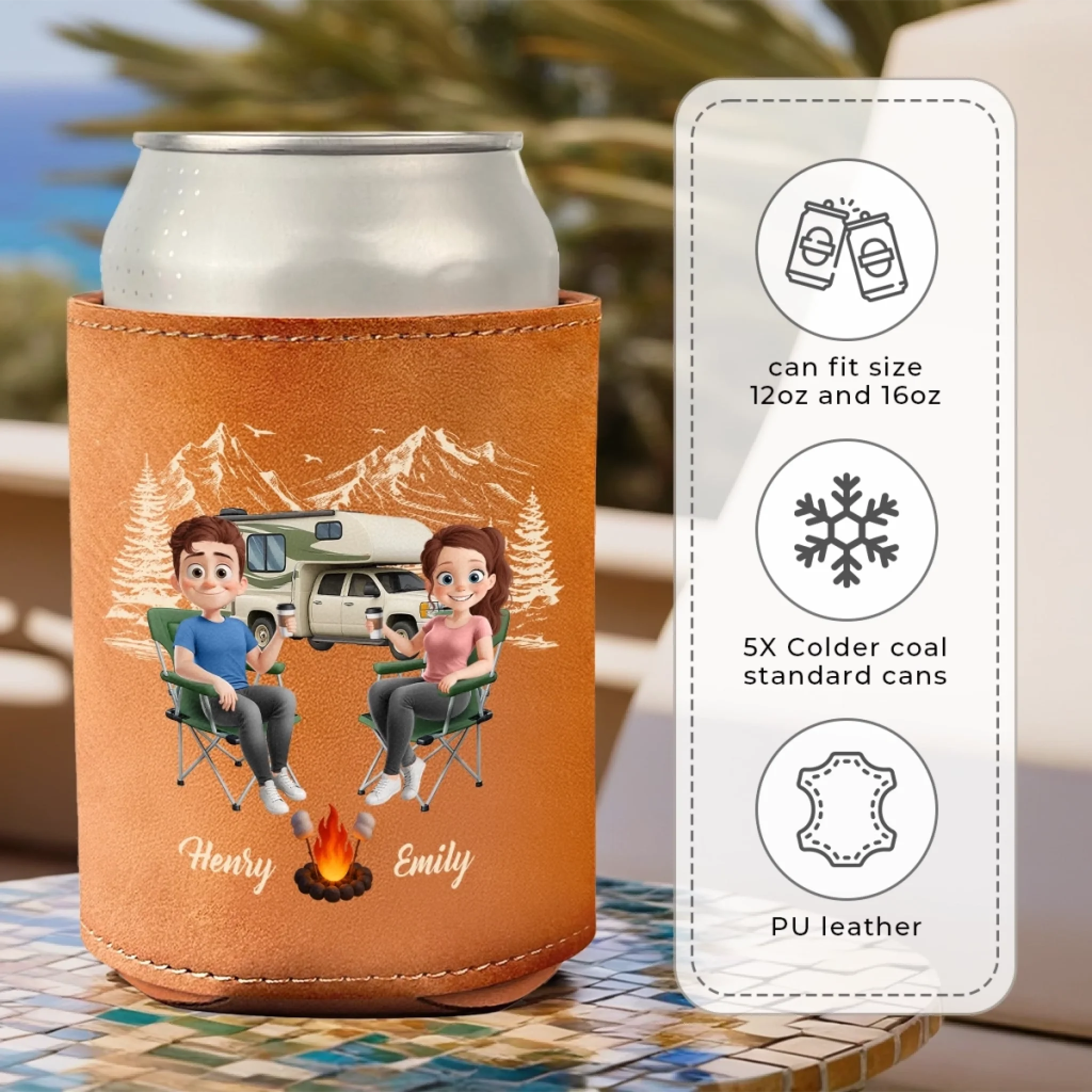 Custom Leather Can Cooler - Personalized Anniversary Wedding Gifts For Campers, Husband And Wife, Him And Her - Lost In The Woods, Found A Beer