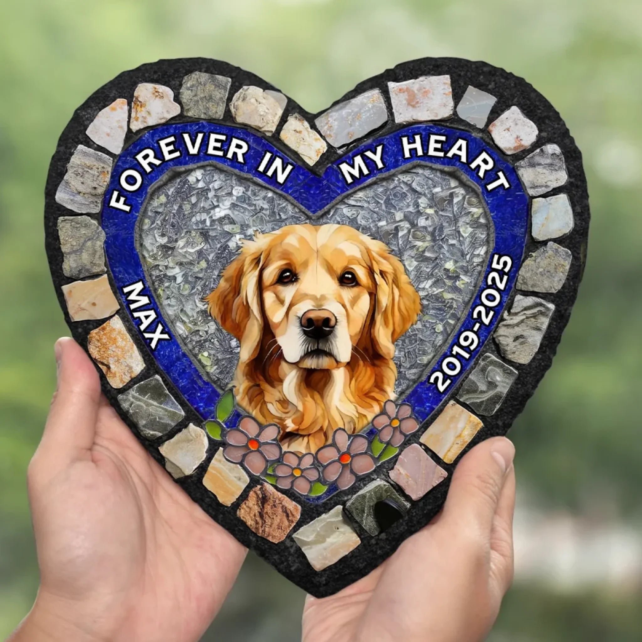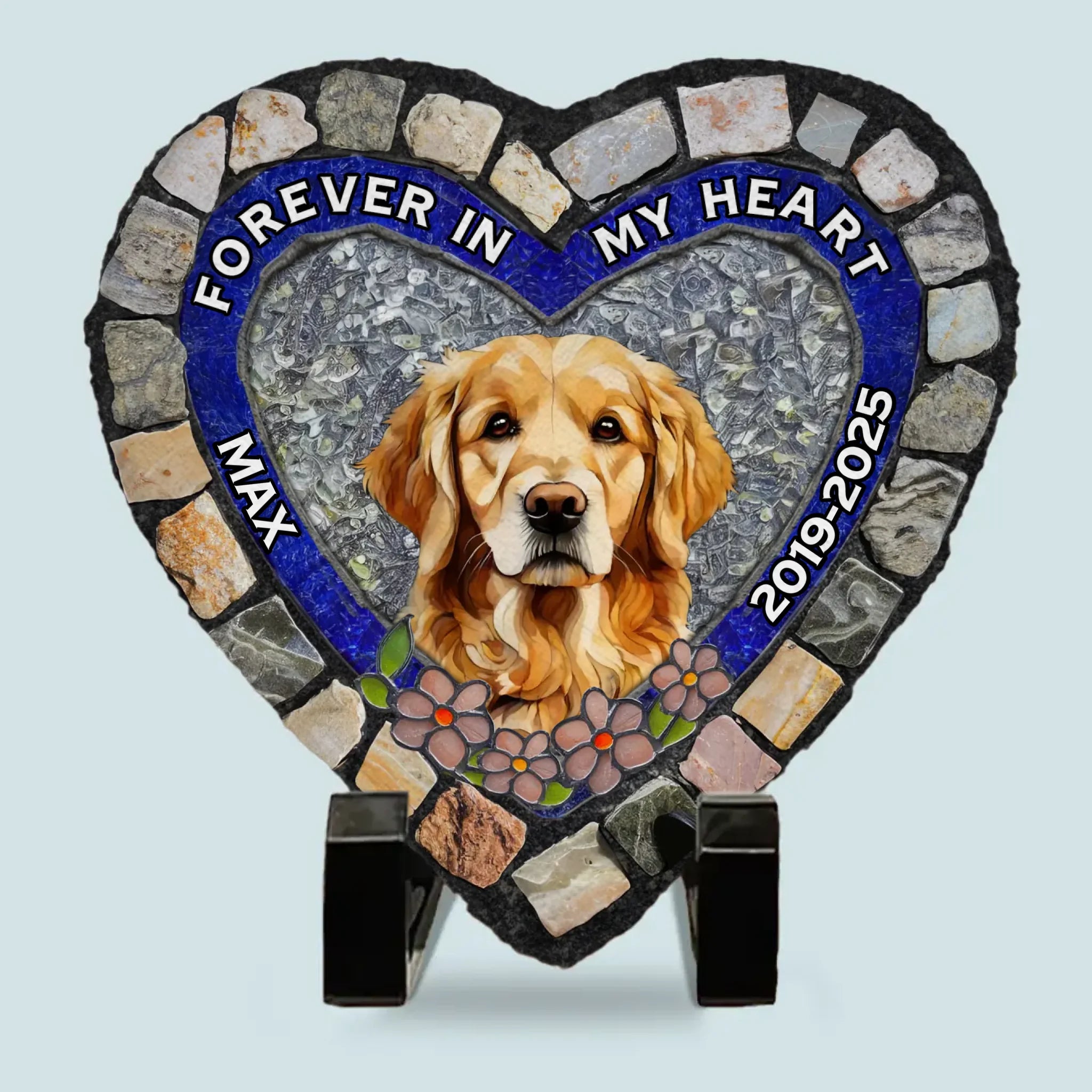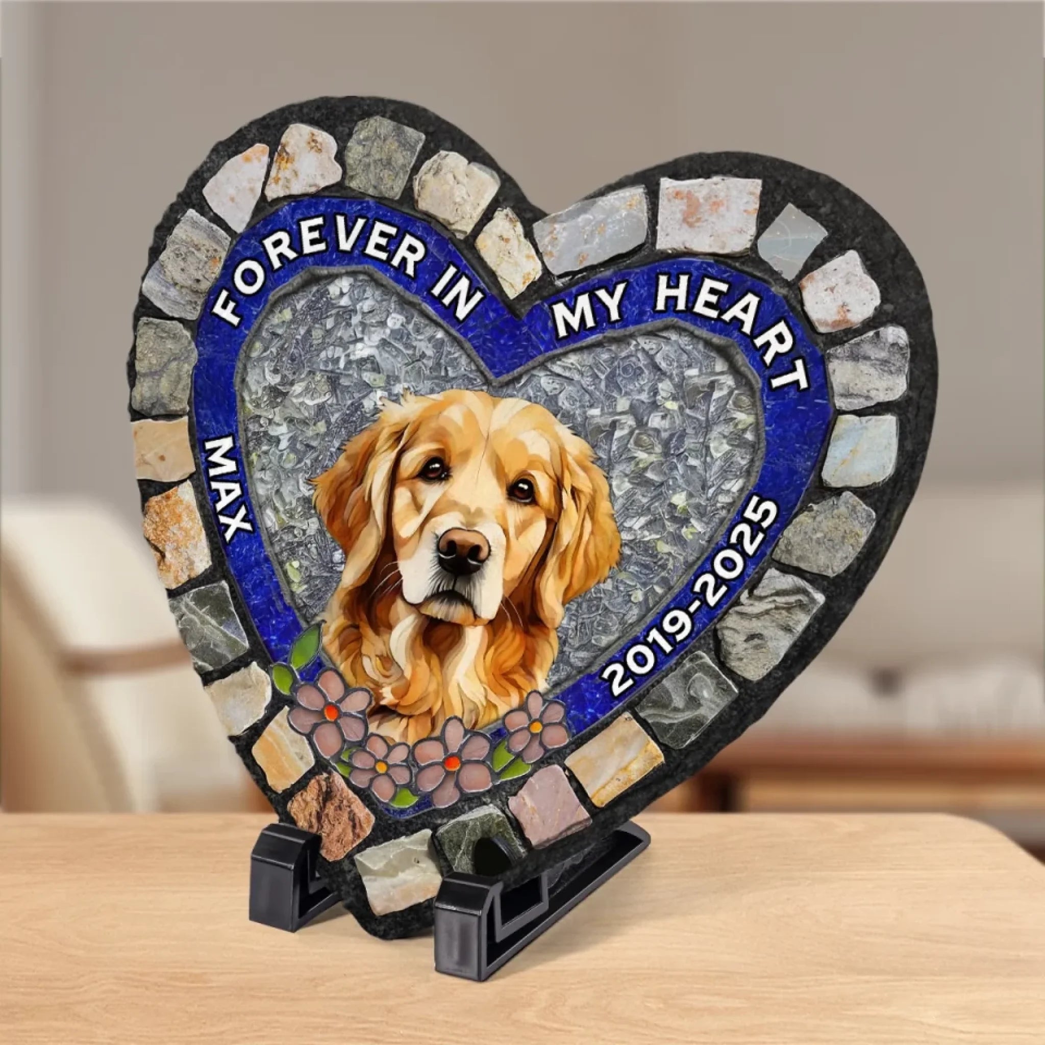 Custom Photo Forever My Furry Angel - Memorial Personalized Custom 3D Mosaic Faux Stained Glass Print Heart Shaped Stone With Stand - Sympathy Gift For Pet Owners, Pet Lovers