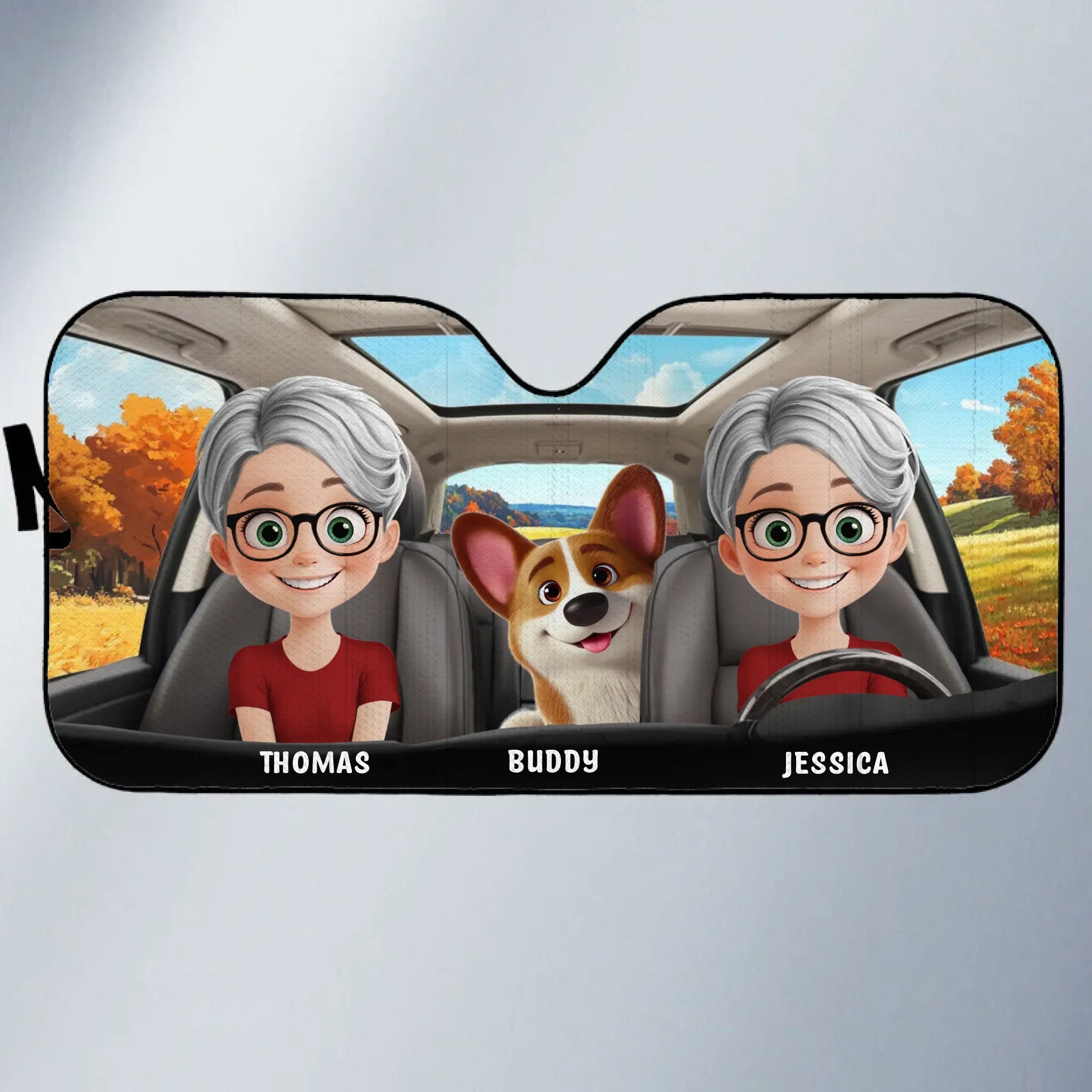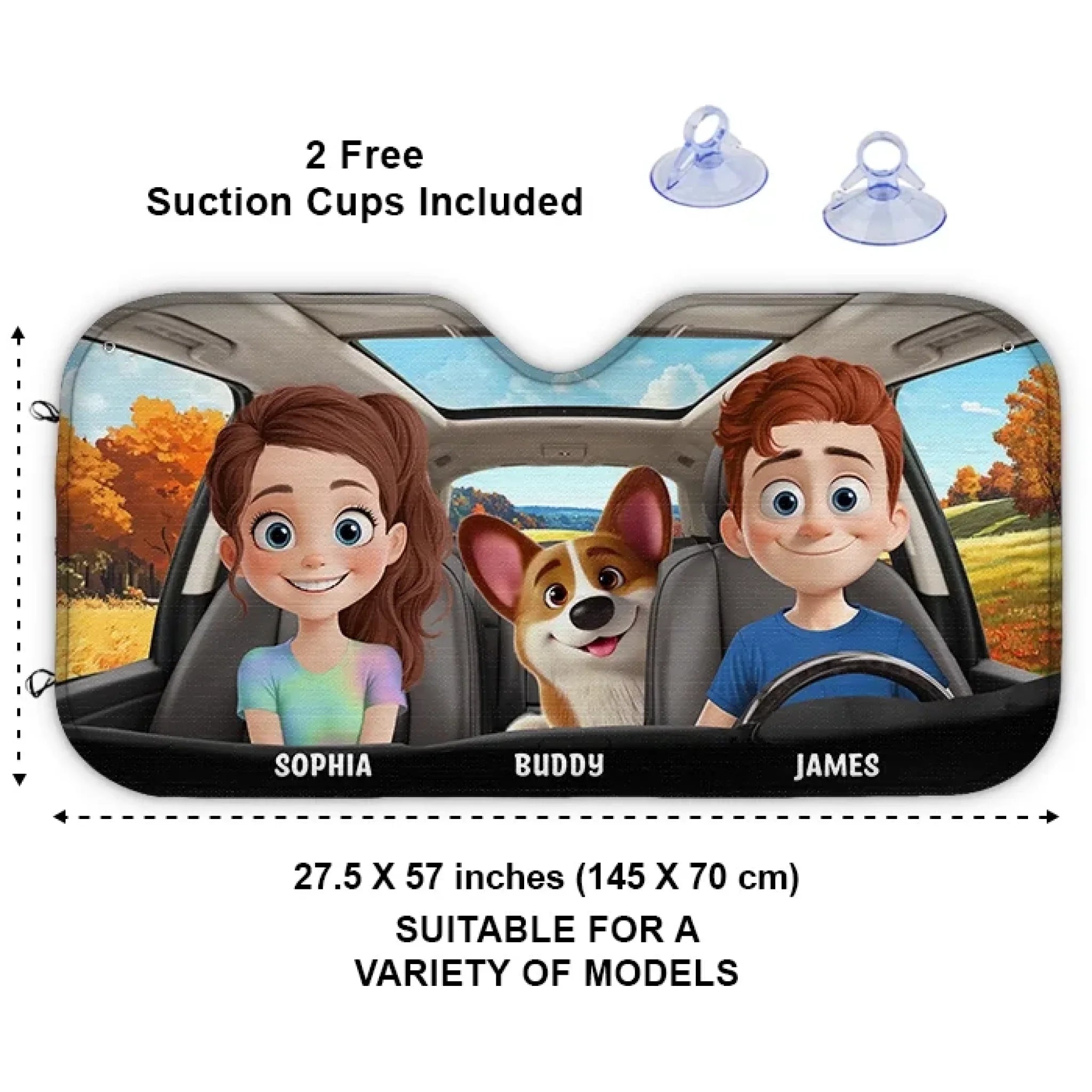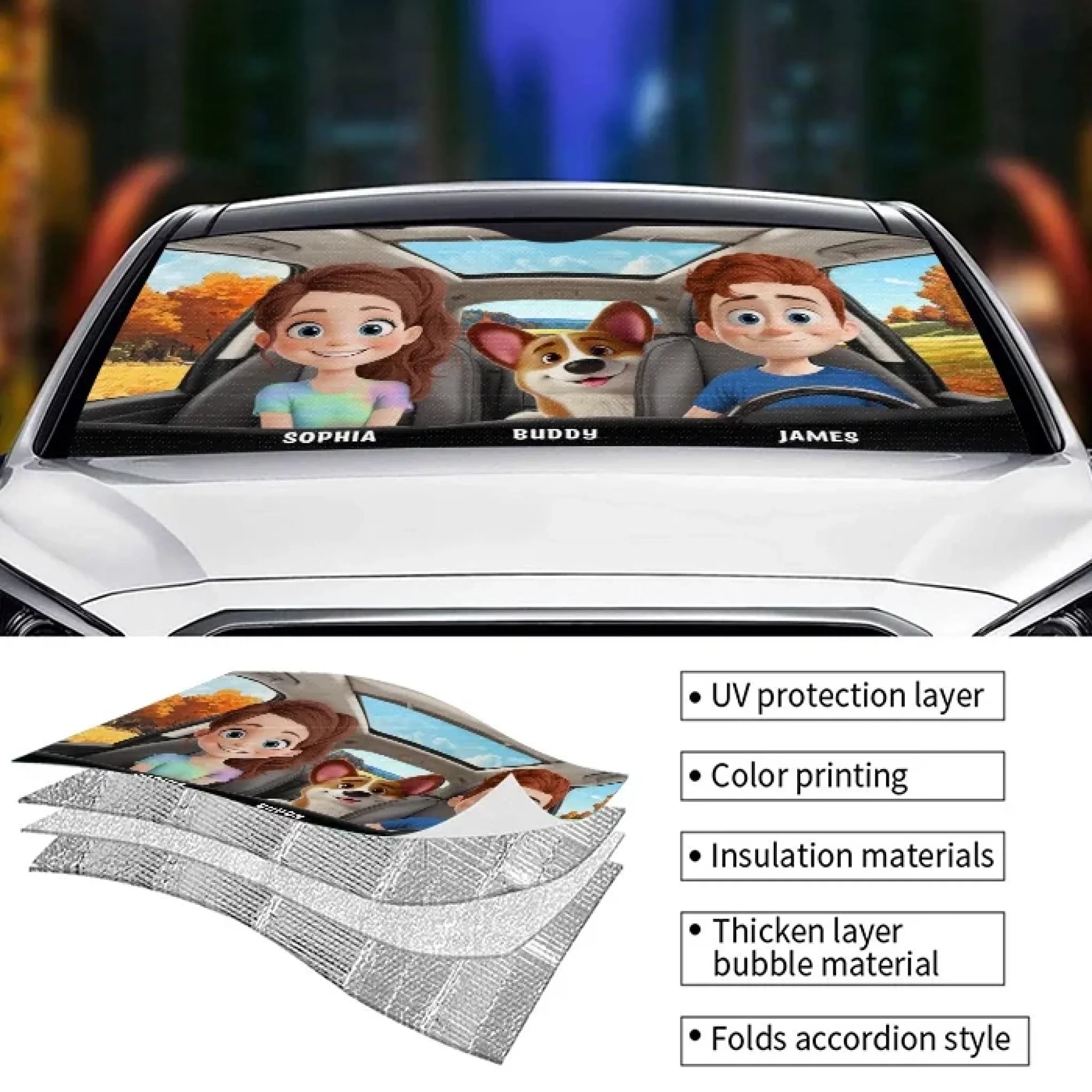 Family Rides And Puppy Vibes - Dog & Cat Personalized Custom Auto Windshield Sunshade, Car Window Protector - Gift For Couple, Anniversary, Pet Owners, Pet Lovers