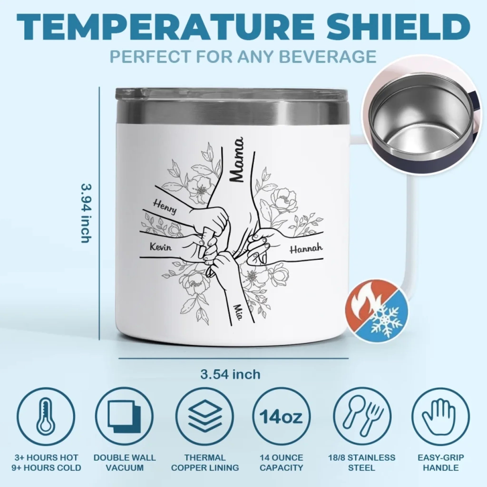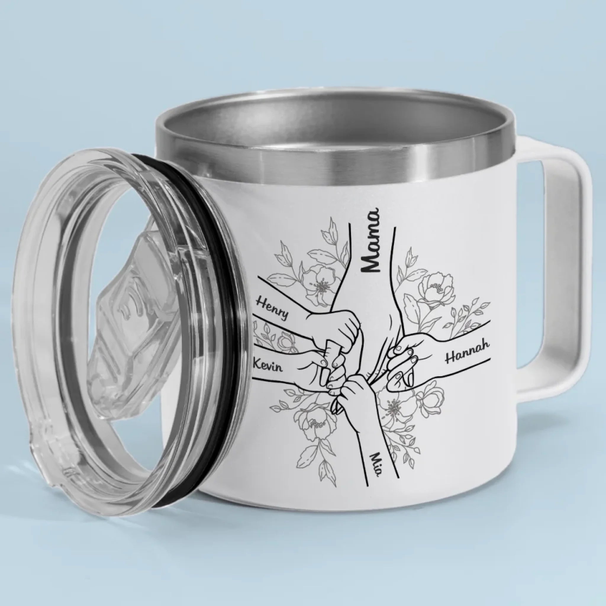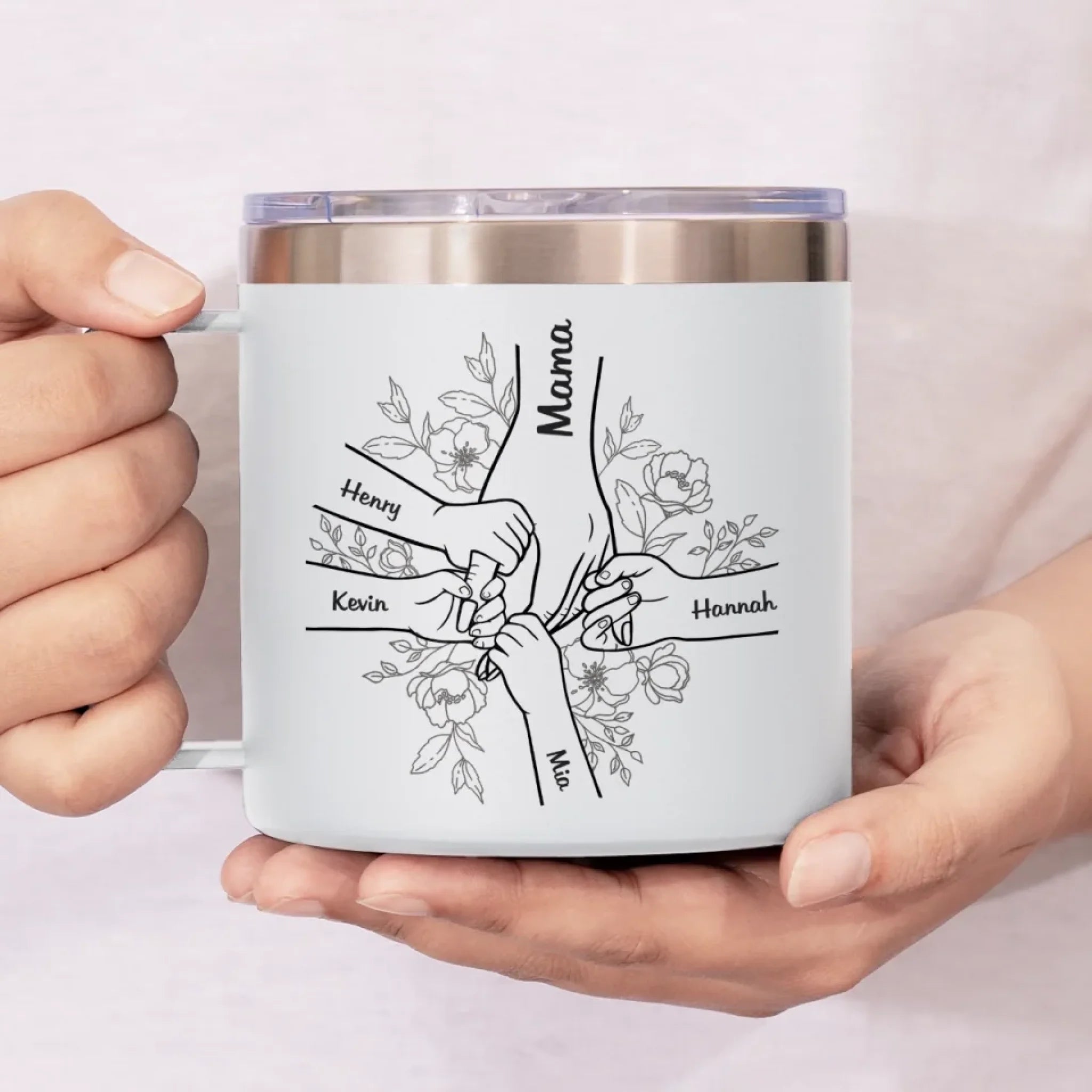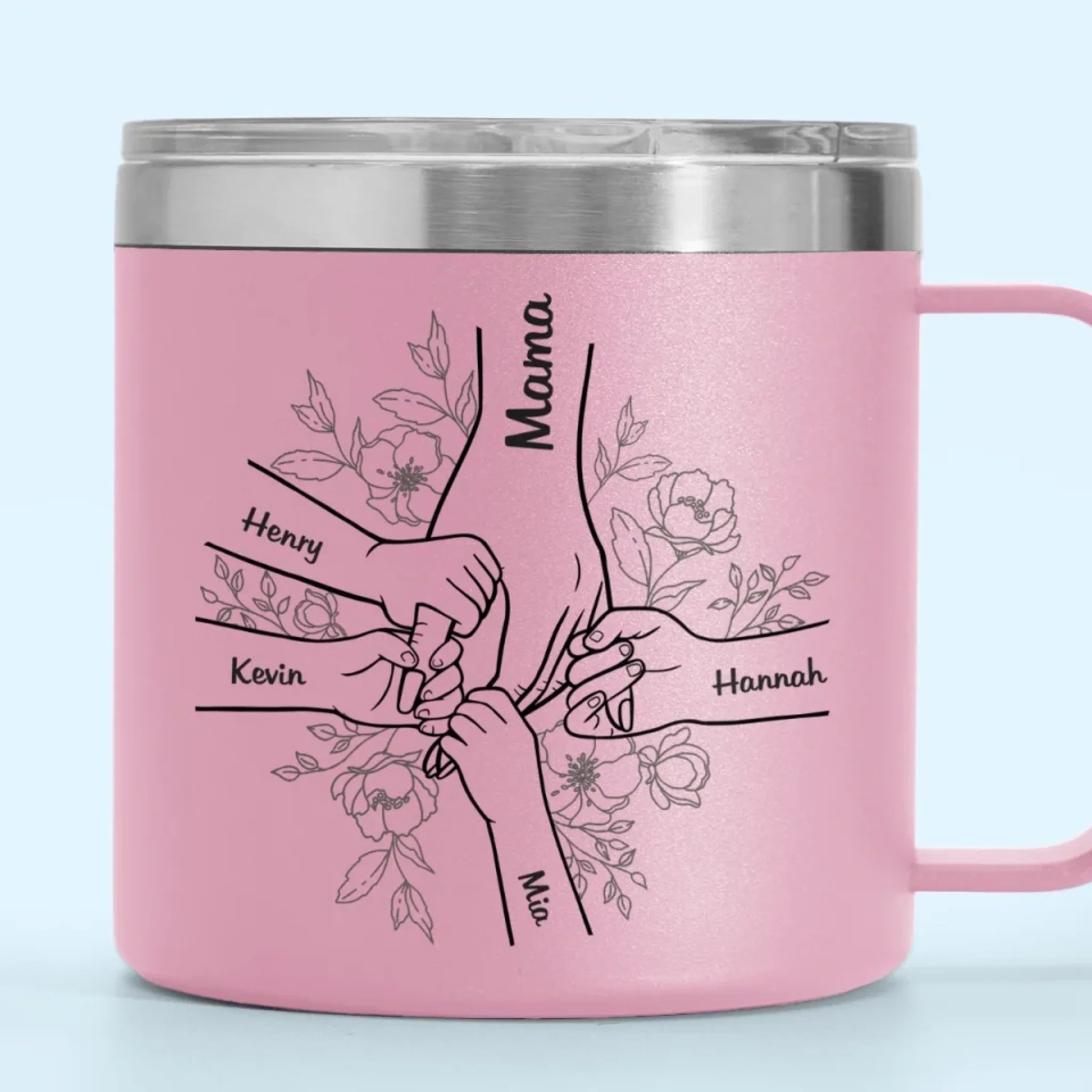 Forever Her Children, Forever In Her Hands - Family Personalized Custom 14oz Stainless Steel Tumbler With Handle - Mother's Day, Gift For Mom, Grandma