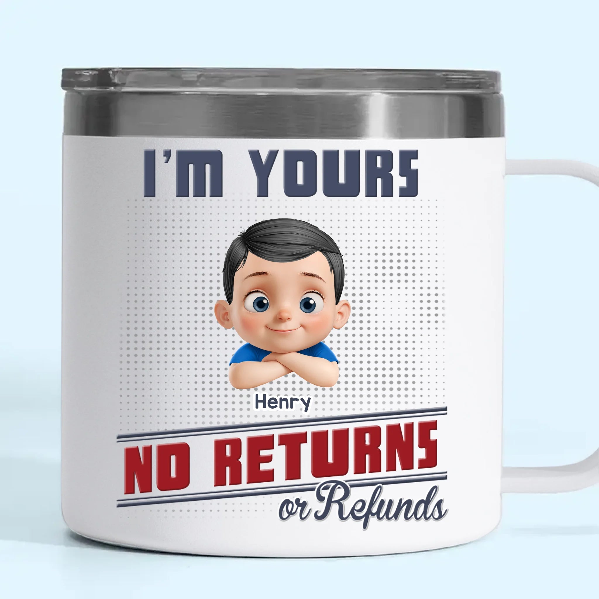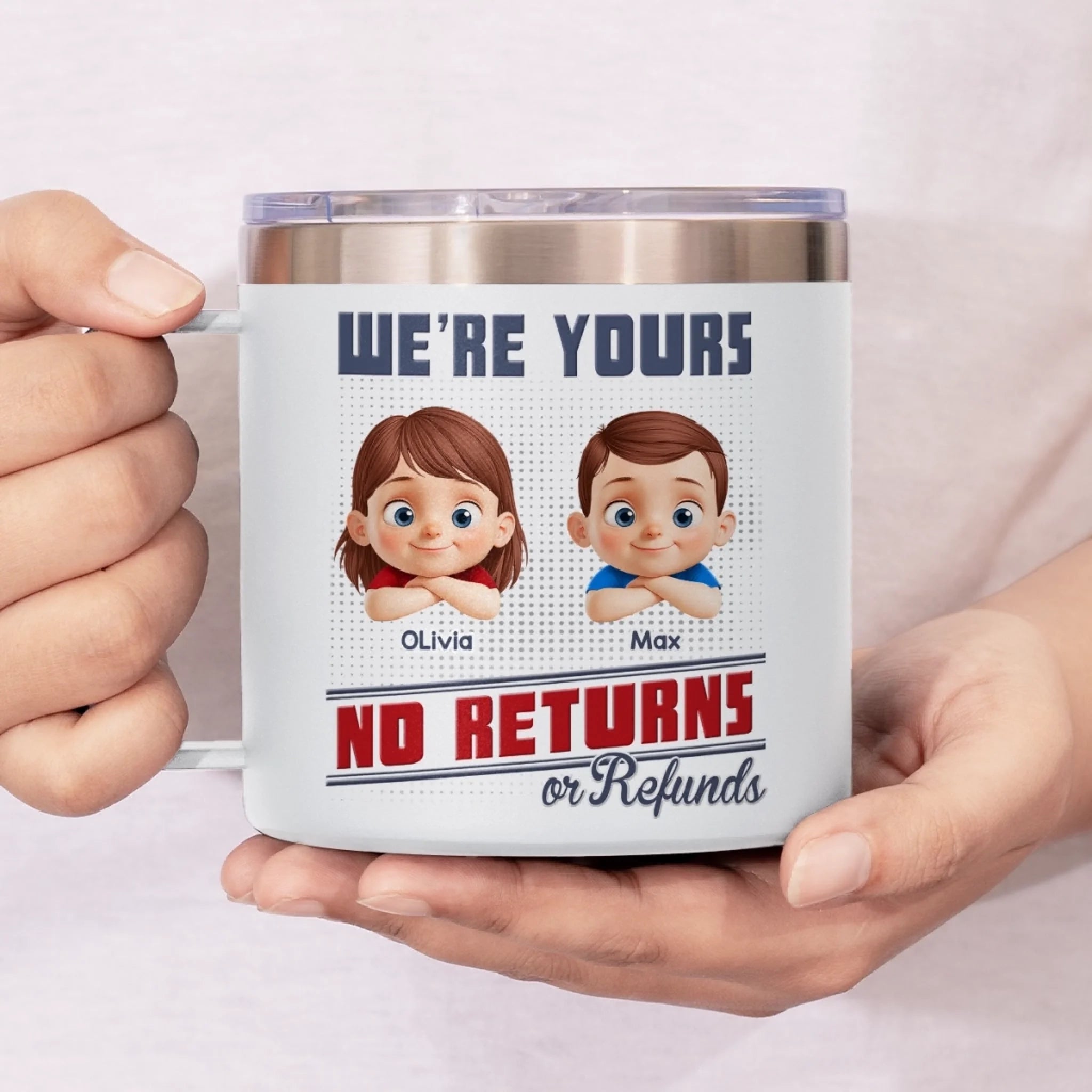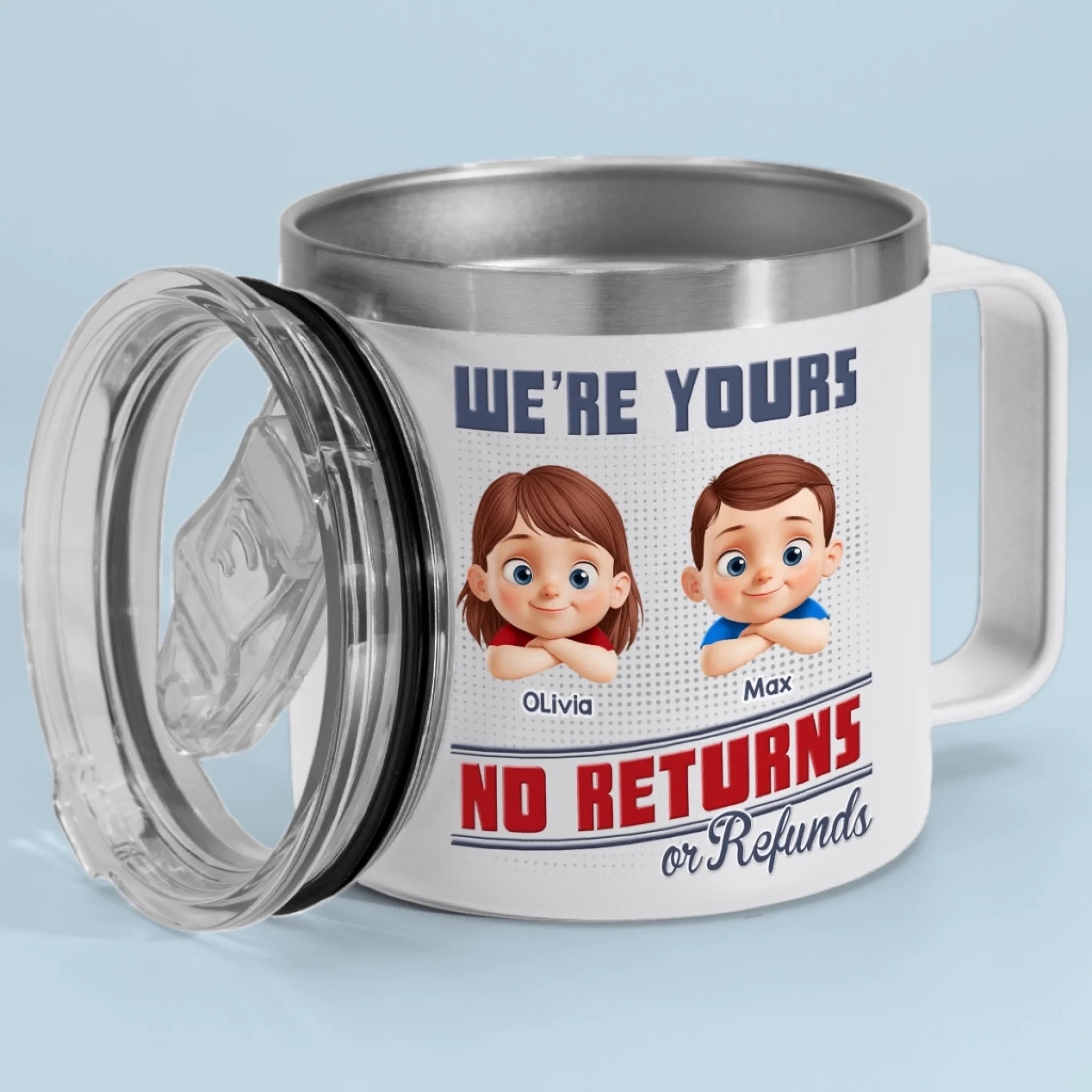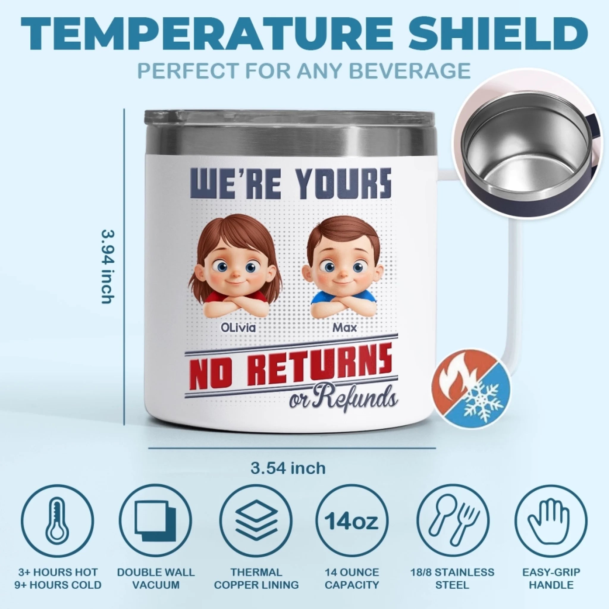 Forever Yours, No Returns Or Refunds - Family Personalized Custom 14oz Stainless Steel Tumbler With Handle - Father's Day, Gift For Dad, Grandpa