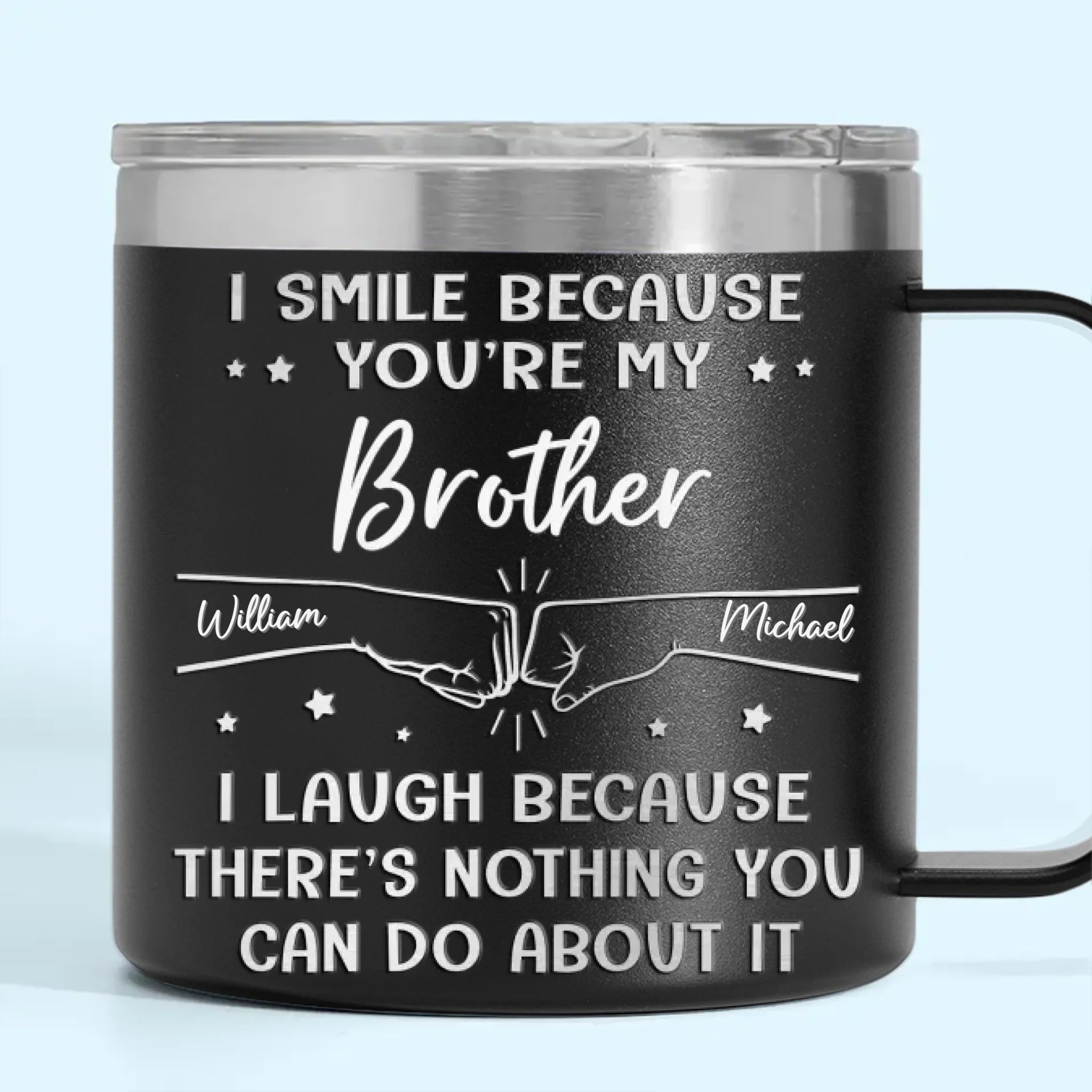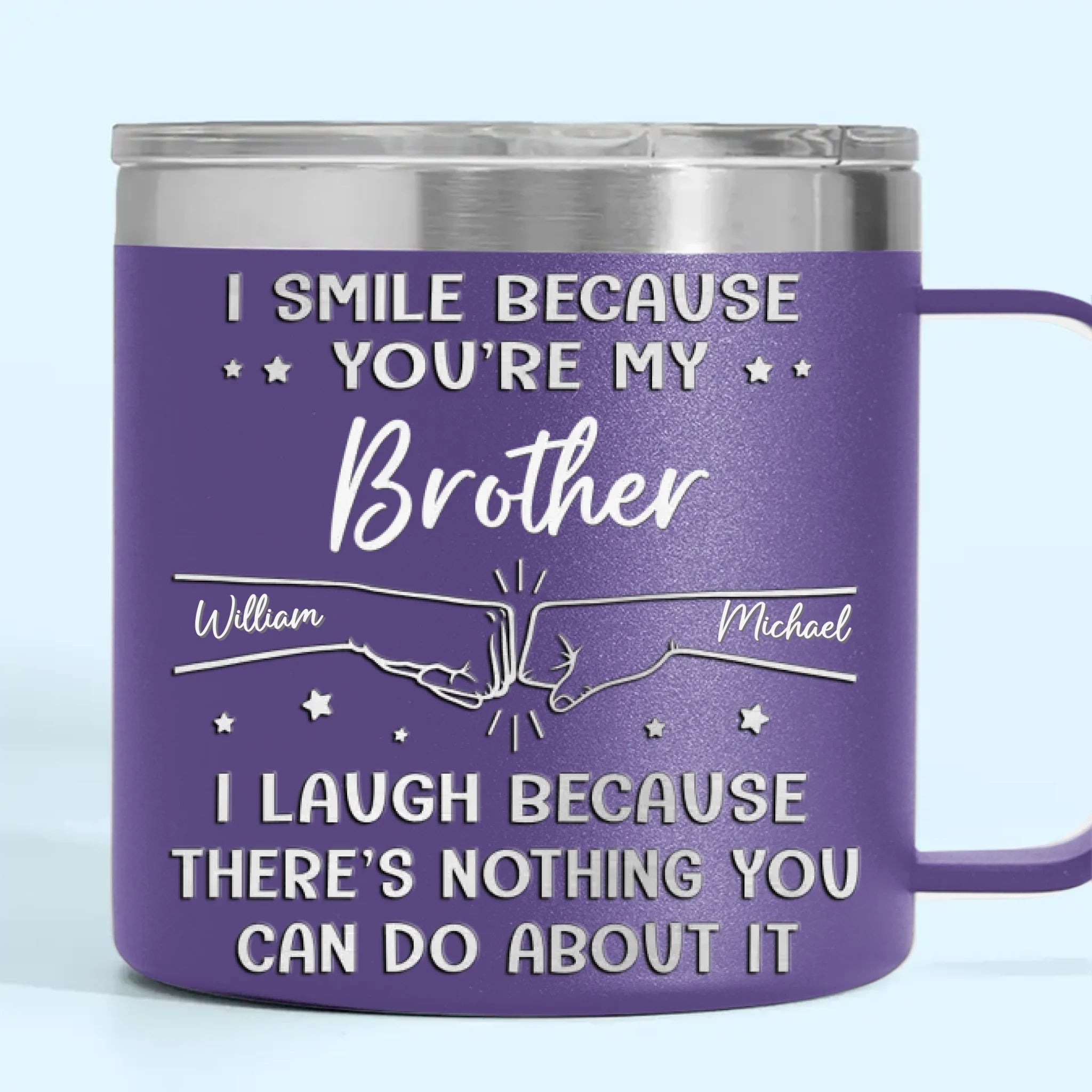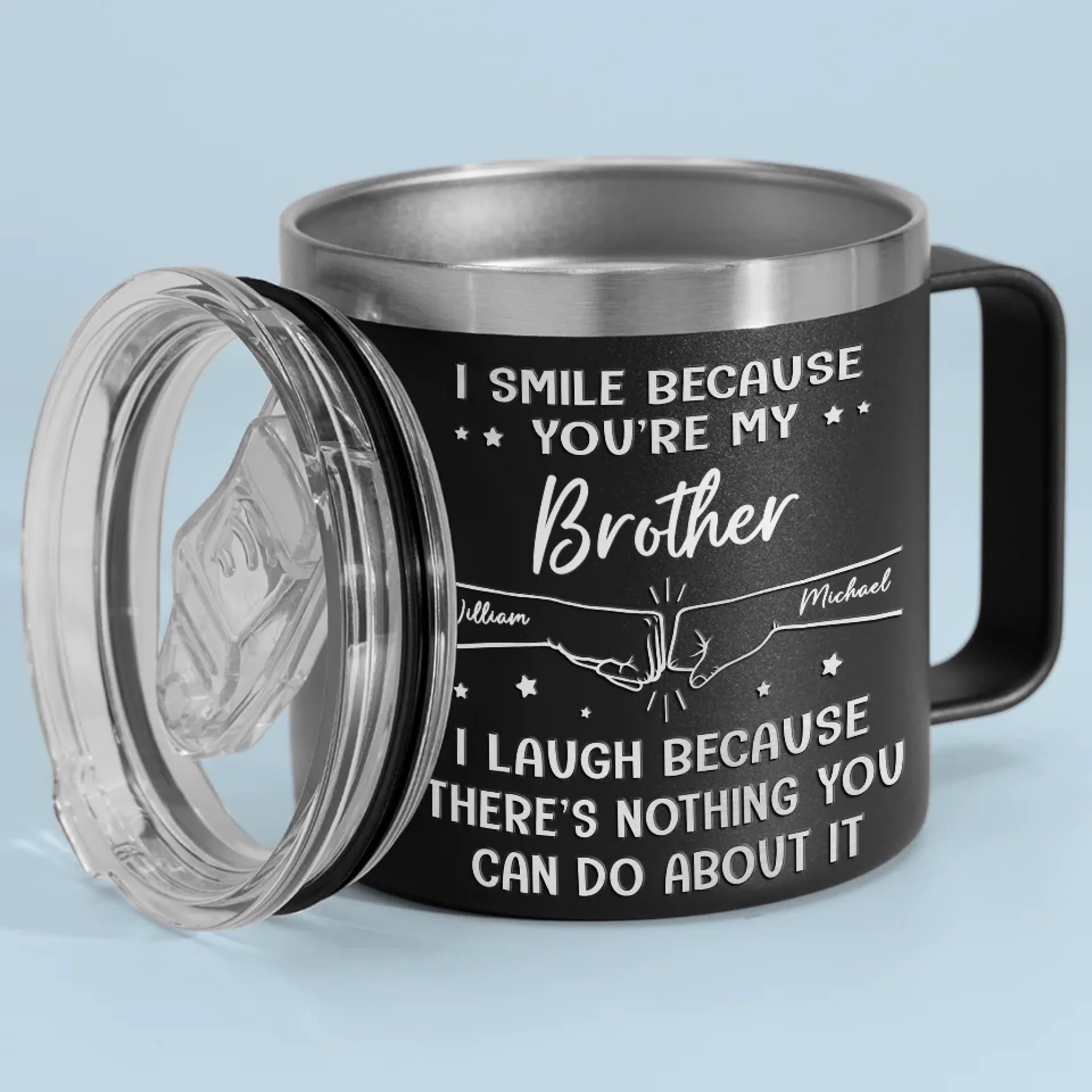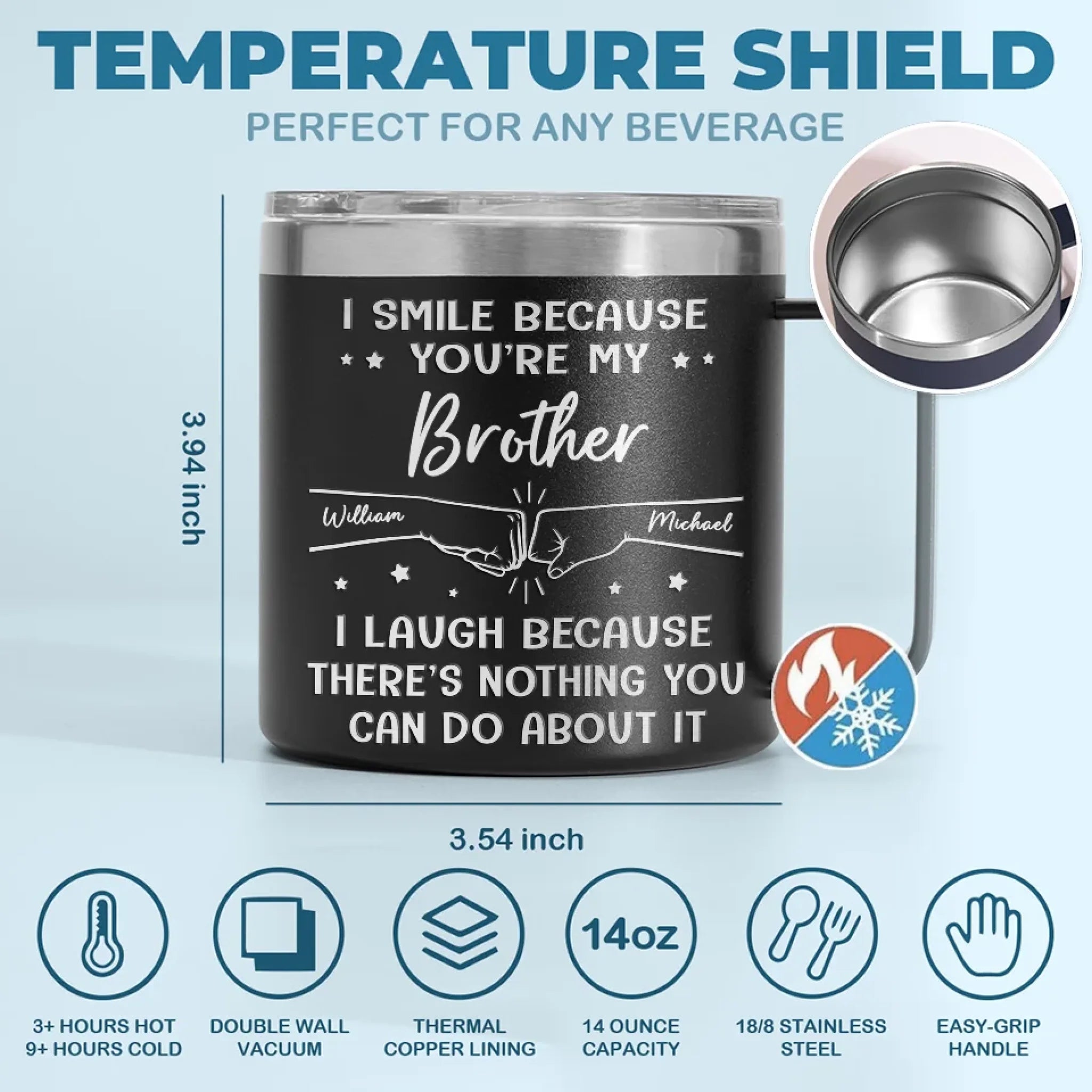 I Smile Because You're My Brother - Family Personalized Custom 14oz Stainless Steel Tumbler With Handle - Gift For Family Members