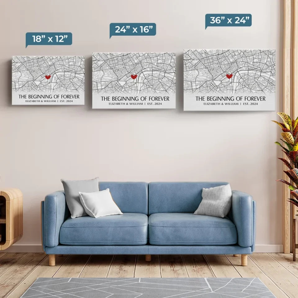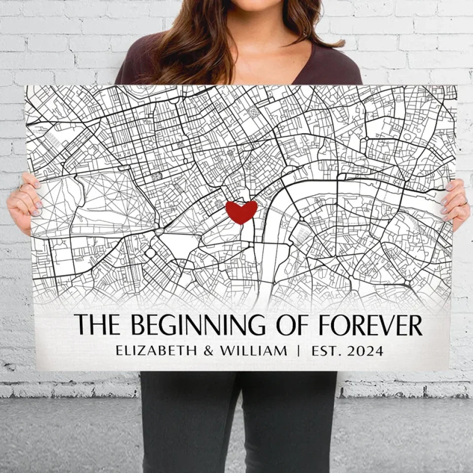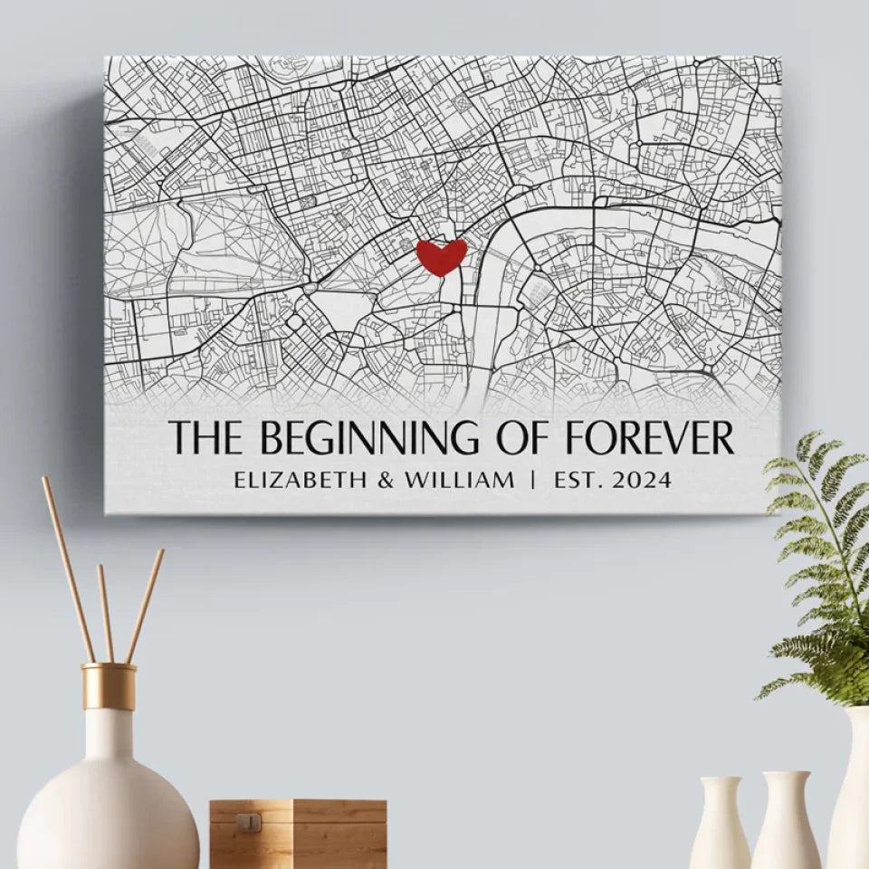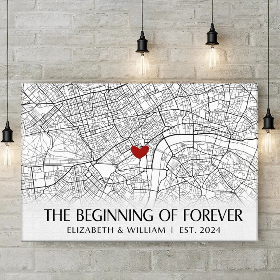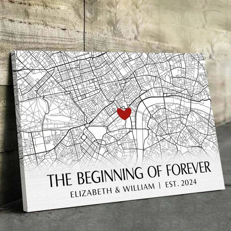 Location Map The Beginning Of Forever - Couple Personalized Custom Map Horizontal Canvas - Map Art, Gift For Husband Wife, Anniversary, Long Distance Relationship