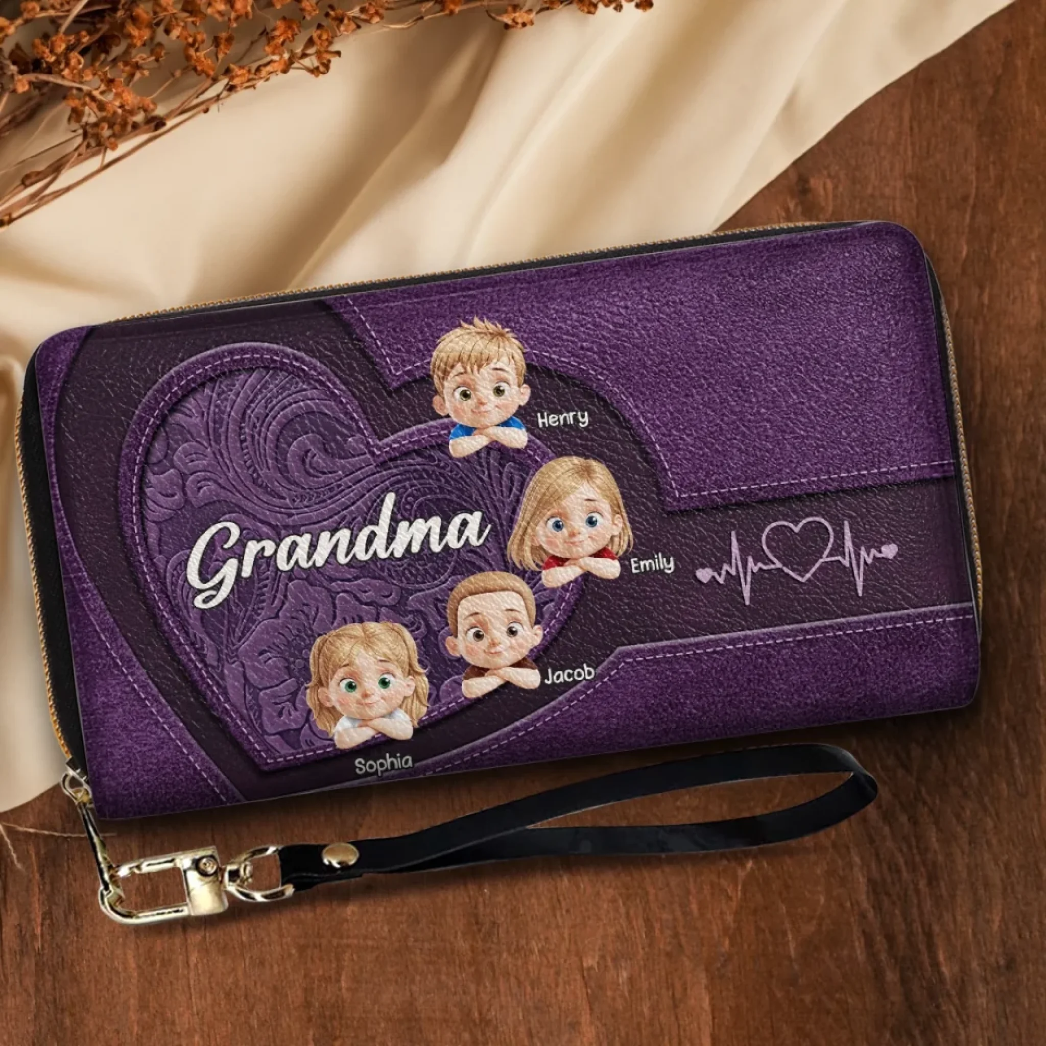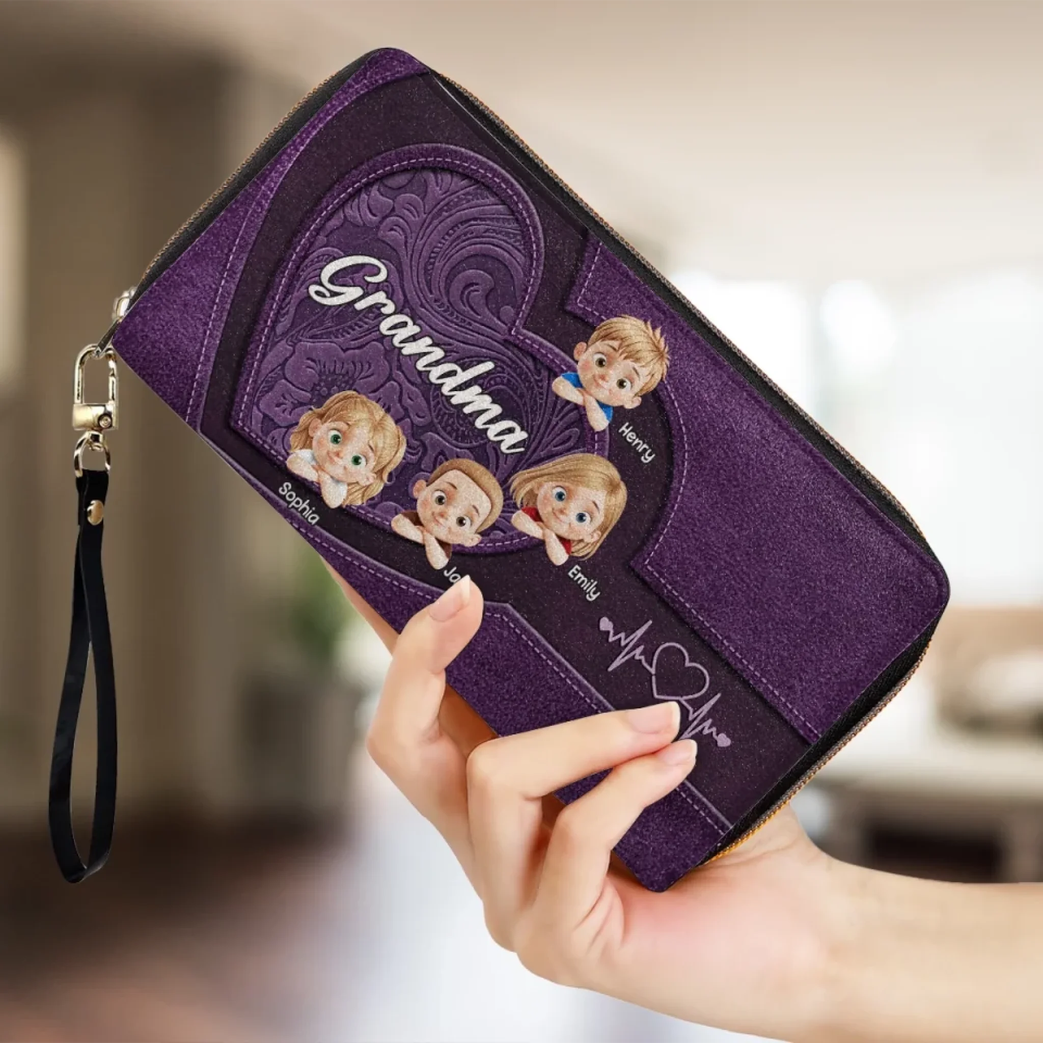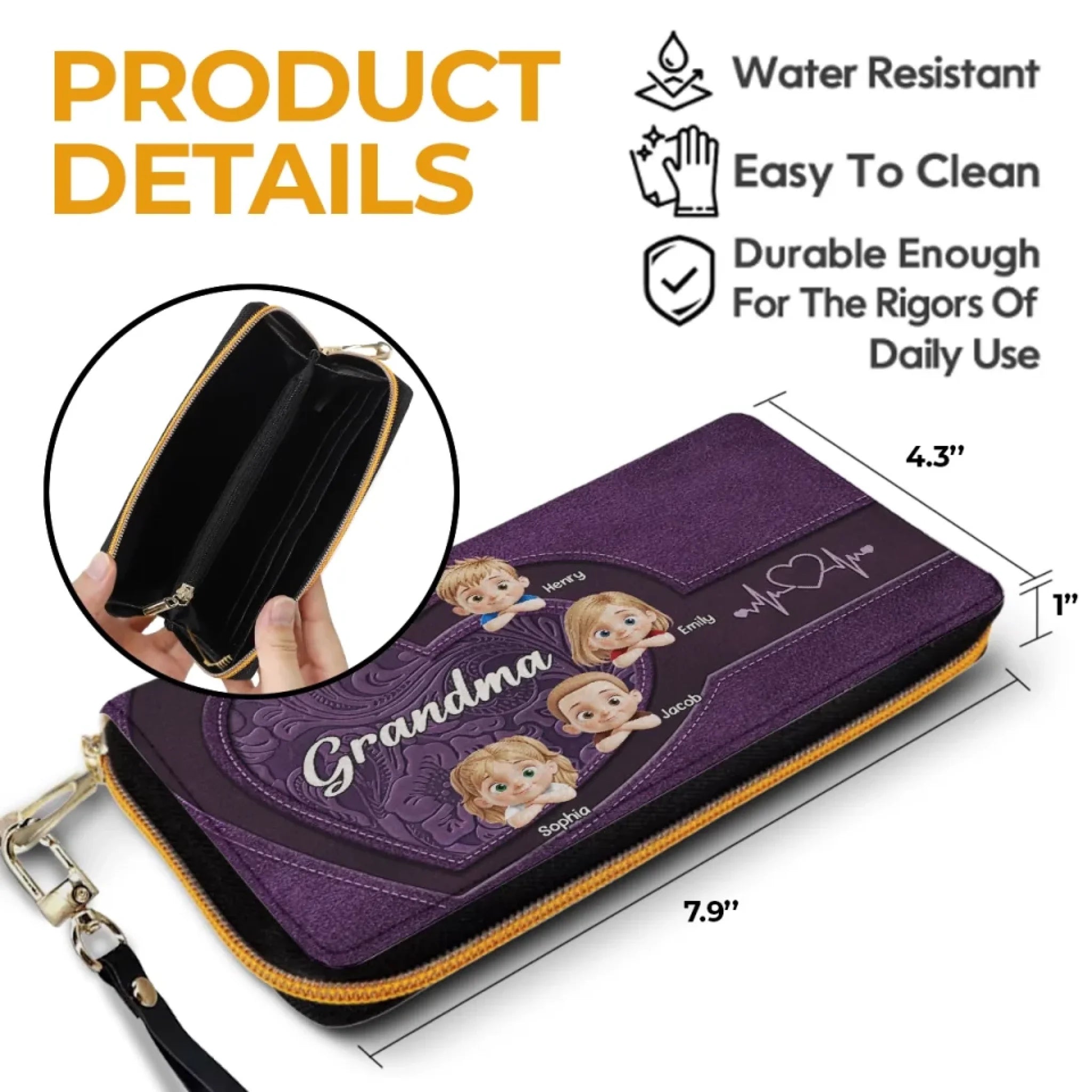 Love Stitched Into Every Hug - Family Personalized Custom Leather Long Wallet - Mother's Day, Gift For Mom, Grandma
