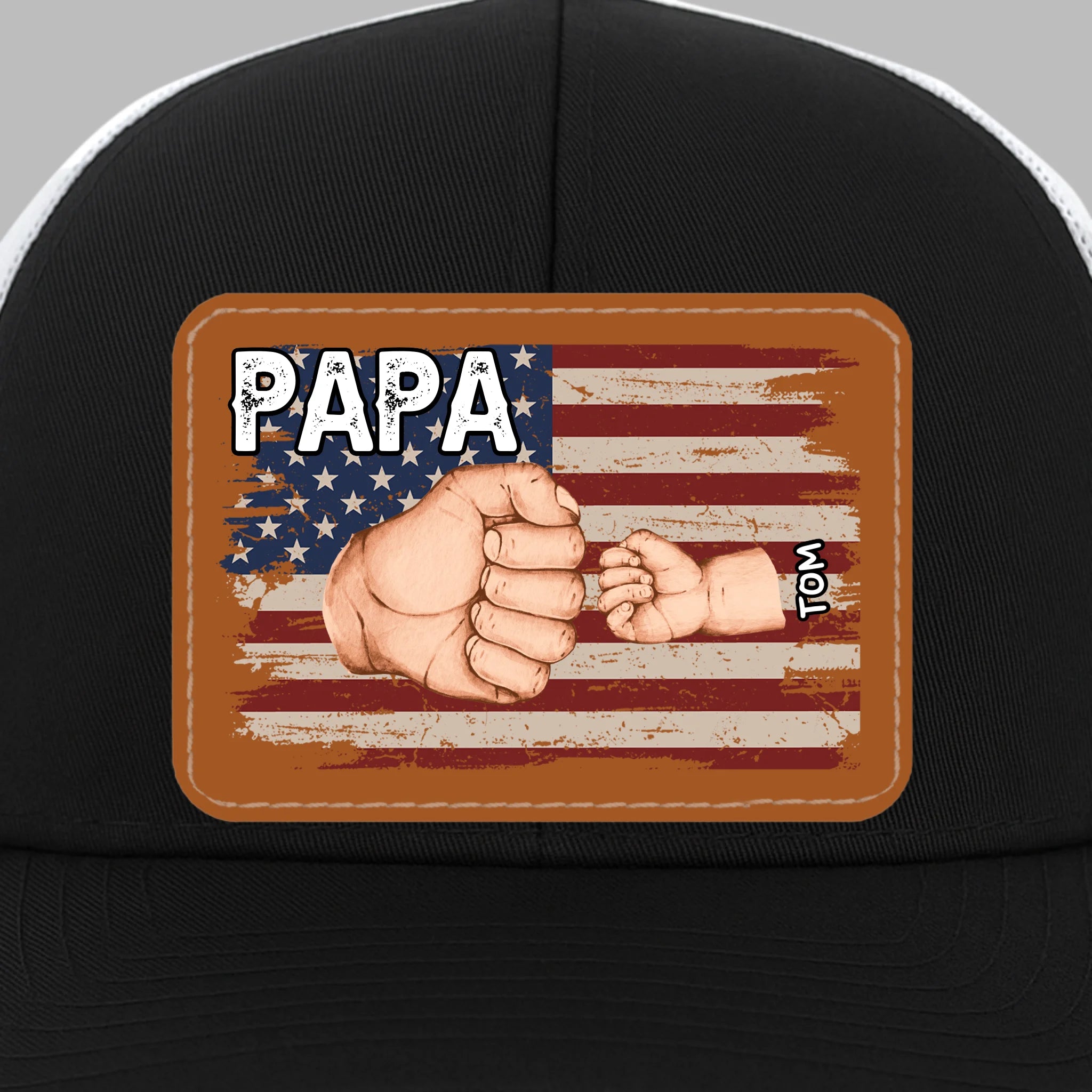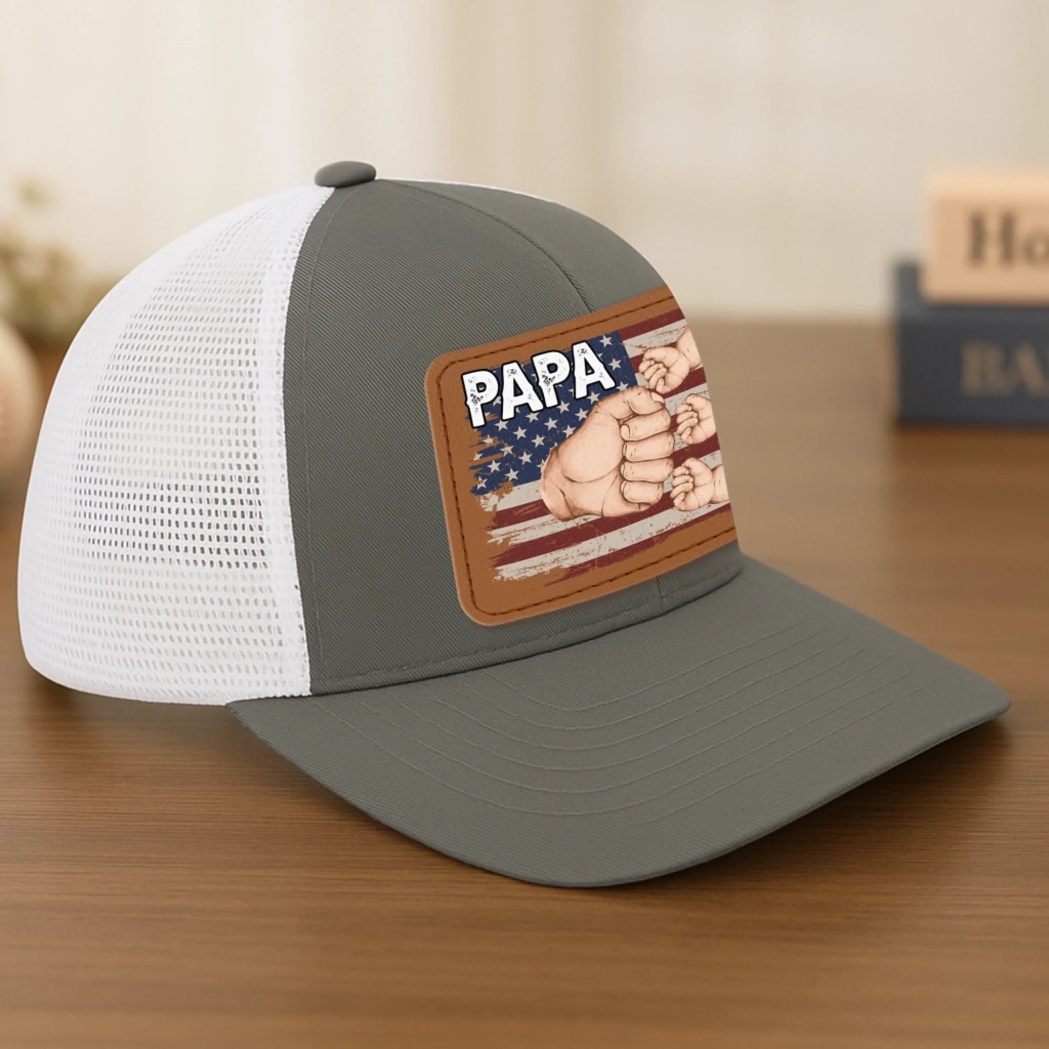 Strong Hands, Soft Heart - Family Personalized Custom Leather Patch Mesh Cap - 4th Of July, Gift For Dad, Grandpa